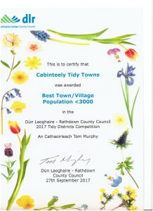 More success for Cabinteely Tidy Towns At the DLR County Council Tidy Districts Awards Ceremony held in The Town Hall, Dun Laoghaire tonight, Cabinteely Tidy Towns won the prize for Best Town/Village (population < 3000). Well done to all our volunteers.